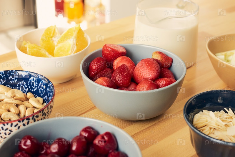 Группа мисок, содержащих ингредиенты для смузи