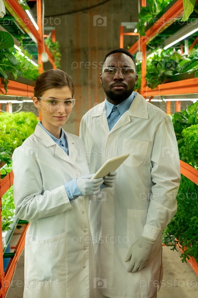 Два молодых уверенных в себе исследователей, стоящих между полками с зелеными саженцами