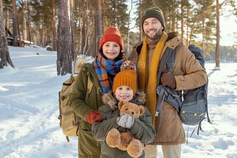 Веселая молодая семья из трех человек в зимней одежде, стоящая в естественной среде