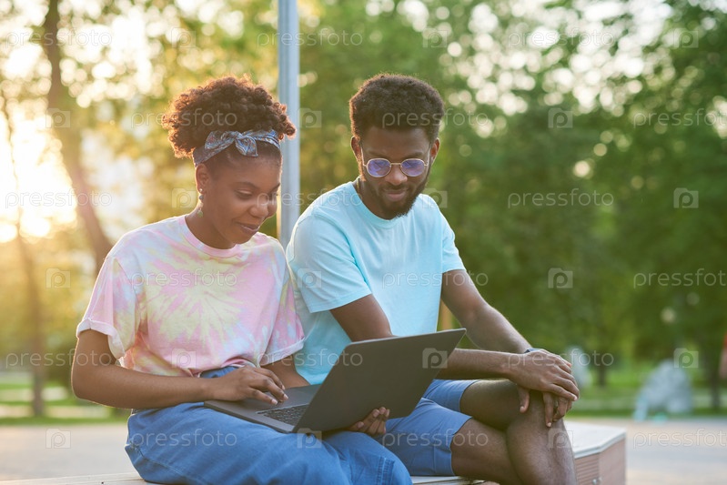 Друзья, использующие ноутбук на открытом воздухе