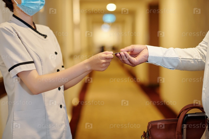 Менеджер отеля дает человеку электронный ключ