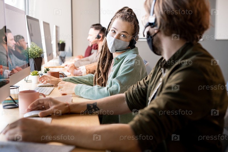 Женщина-оператор колл-центра в защитной маске консультируется с мужчиной-коллегой