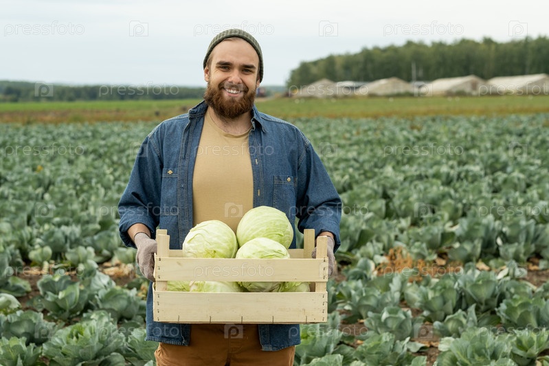 Счастливый человек с ящиком капусты