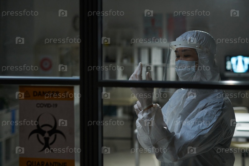 Молодая женщина-клиницистка в защитной рабочей одежде, надевающая перчатки на руки перед началом работы