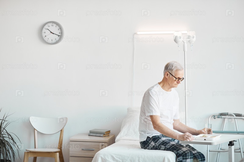 Мужчина ест пищу в больничной комнате