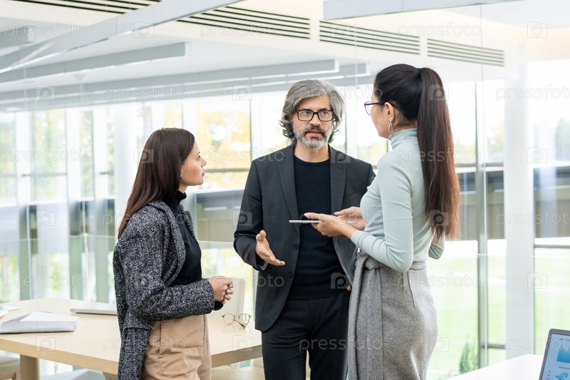 Две молодые бизнес-женщины и зрелый предприниматель обсуждают новые идеи для бизнеса