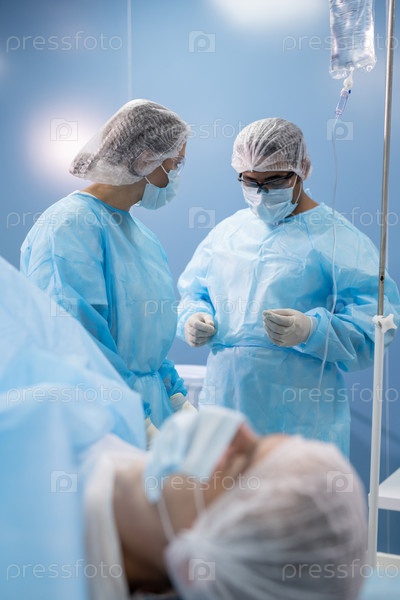 Молодая ассистентка и хирург-мужчина в форме готовят медицинские инструменты