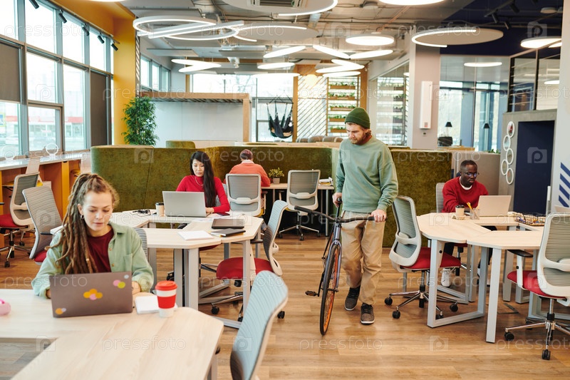 Бородатый офисный менеджер держит велосипед, перемещаясь между столами коллег
