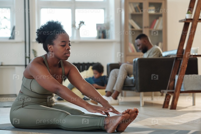 Молодая африканская женщина в спортивном костюме сидит на полу гостиной во время физических упражнений