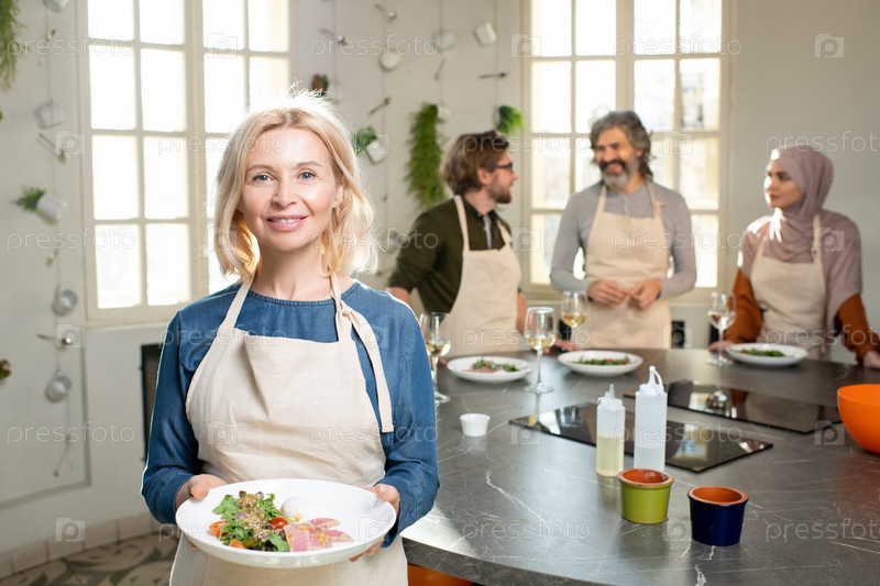 Счастливая блондинка-зрелая женщина в фартуке смотрит на тебя с улыбкой против группы людей за столом