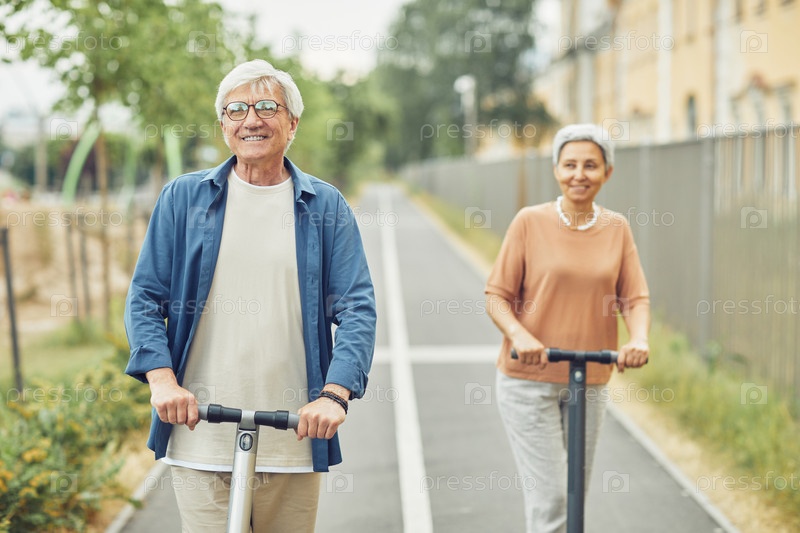 Зрелая пара едет на электрических скутерах