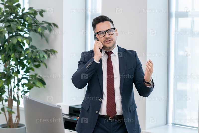 Уверенный брокер в формальной одежде консультирует клиента по телефону