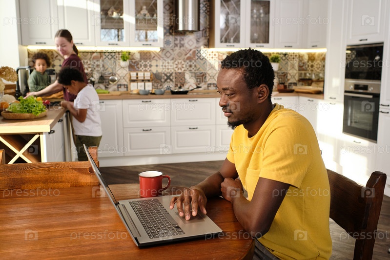 Молодой африканский мужчина, сидящий за деревянным столом и общаясь в сети