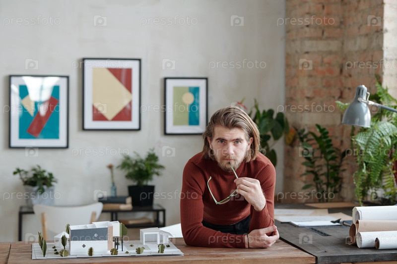 Молодой бородатый мужчина-архитектор в повседневной одежде наклоняется над столом с моделью нового дома