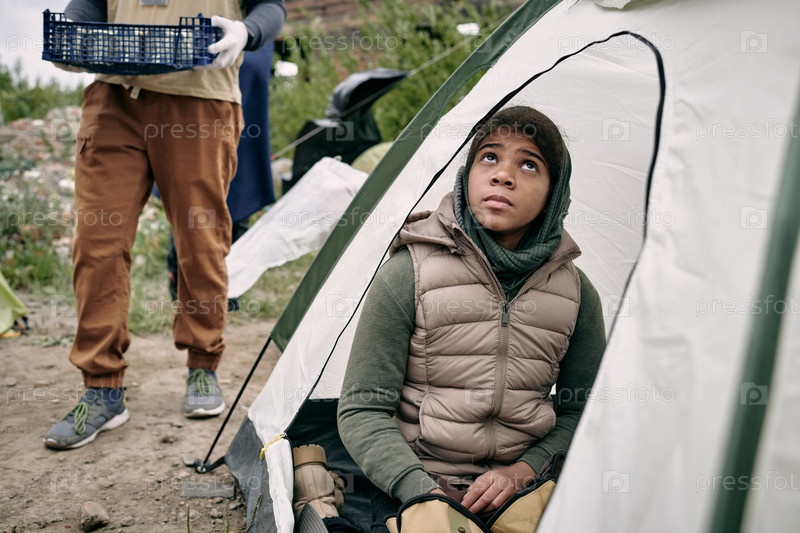 Африканский ребенок в повседневной одежде сидит в палатке и смотрит вверх