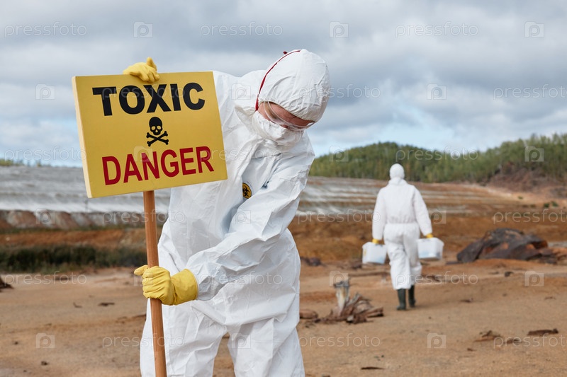 Эколог в респираторной маске и защитном костюме отмечает зону с знаком, объявляющим о токсичной и опасной зоне