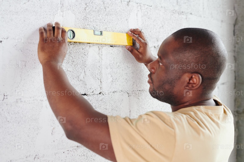 Молодой африканский мужчина стоит перед белокрашенной кирпичной стеной и использует инструмент для измерения уровня