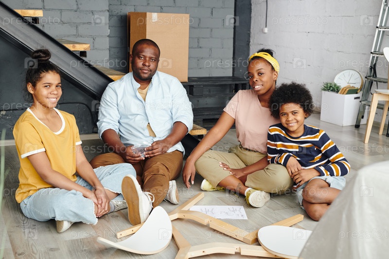 Веселая африканская семья отца, матери и двух детей сидит на полу большой гостиной