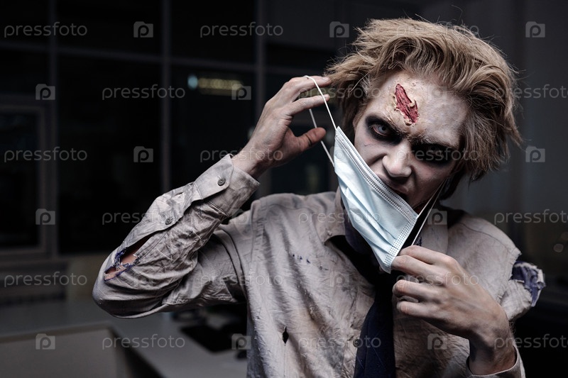 Мертвый бизнесмен, держащий защитную маску за лицо и смотрящий на вас с мрачным выражением лица