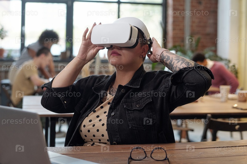 Молодая офисная работница в VR гарнитуре смотрит виртуальную презентацию