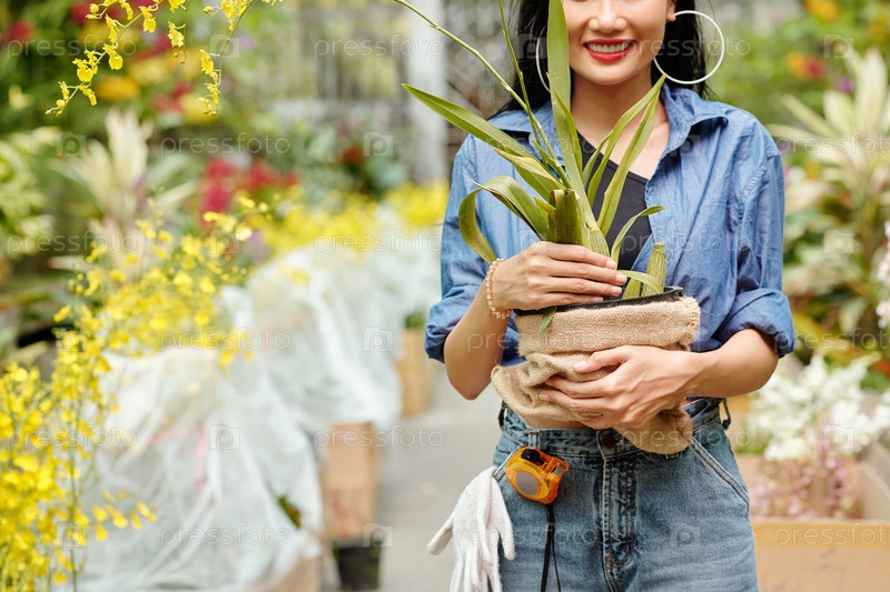 Женщина купила цветок в горшке