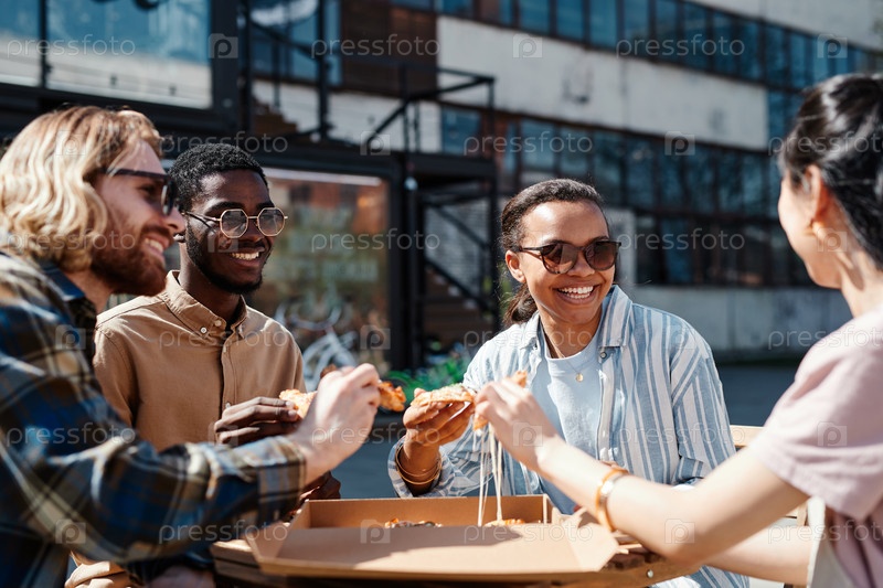 Друзья, которые едят пиццу на свежем воздухе