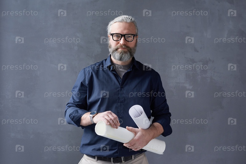 Успешный зрелый архитектор с чертежом