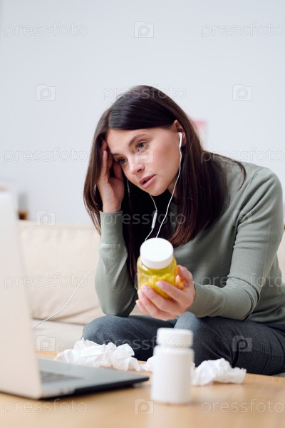 Больная женщина-пациент в домашней одежде держит бутылку с таблетками, сидя на диване