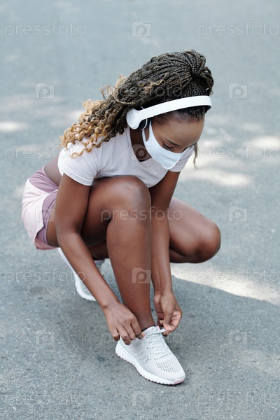 Молодая женщина, завязывающая шнурки обуви