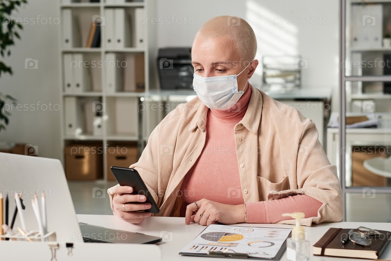Концентрированная молодая лысая женщина в маске сидит со смартфоном за столом, работая с деловыми документами в офисе