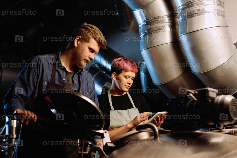 Молодая женщина использует планшет, прокручивая список стадий обработки пива