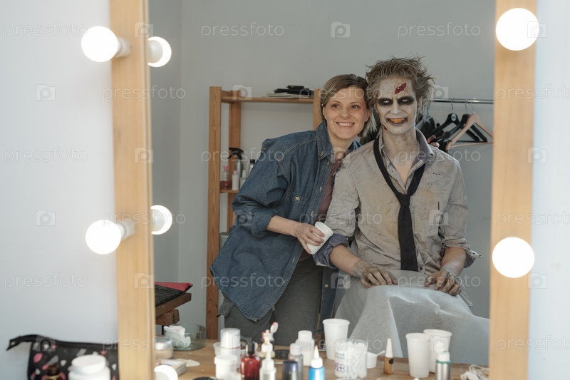 Отражение в зеркале женского гримёра и юного улыбающегося жуткого мужчины с мазью зомби