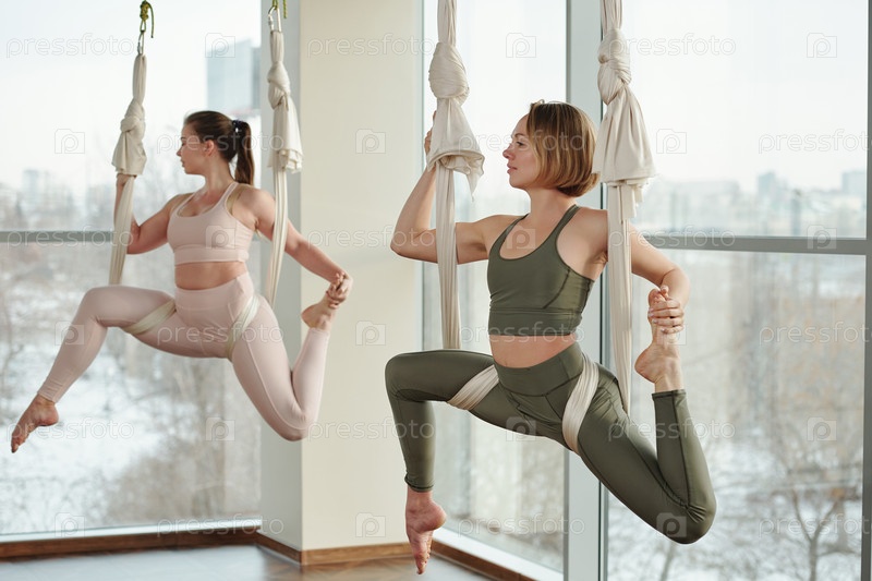 Две молодые активные женщины в спортивных костюмах сидят на гамаках для летной йоги и висят над полом тренажерного зала
