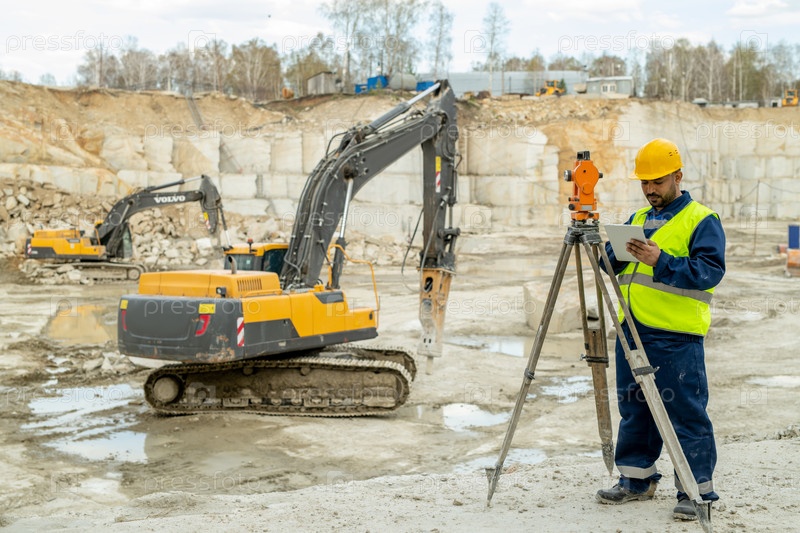Инженер в рабочей одежде стоит у геодезической станции