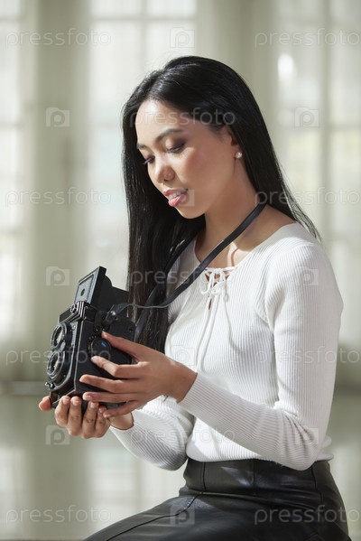 Длинношерстная женщина смотрит цифровые фотографии на камеру