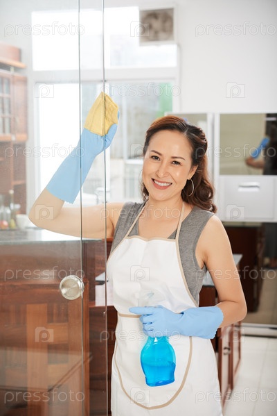 Домашняя хозяйка очищает стеклянные двери