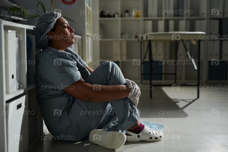 Боковой вид молодой усталой смешанной женщины-клиницистки, держащей глаза закрытыми во время отдыха
