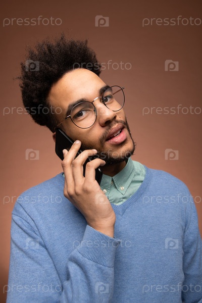 Молодой бизнесмен смешанной расы смотрит на вас во время делового звонка