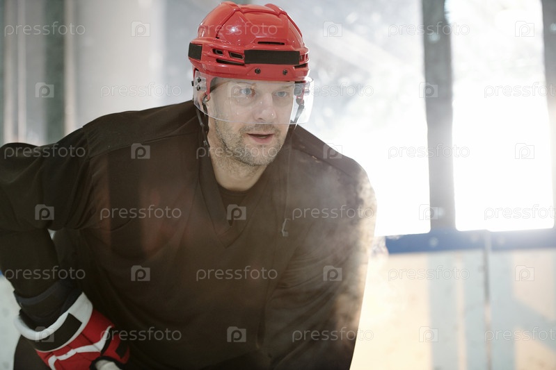 Зрелый хоккеист в защитном шлеме и перчатках ждет шайбу соперника