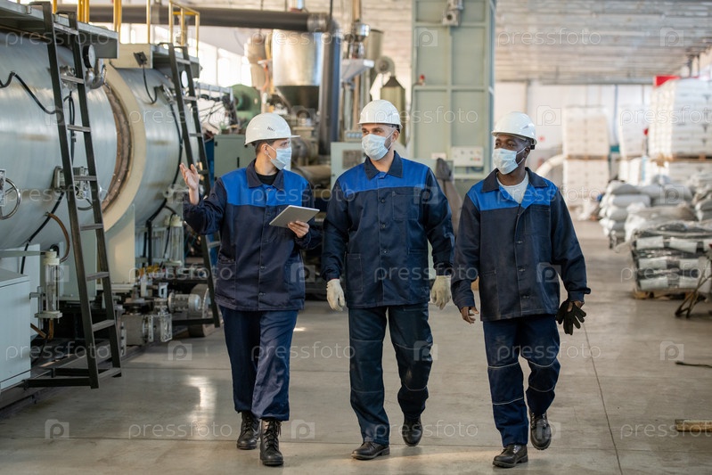 Трое молодых межкультурных рабочих большой фабрики обсуждают особенности новых промышленных машин