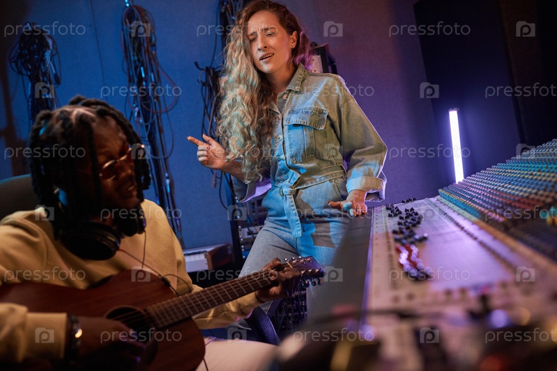 Молодая певица поет песню в студии