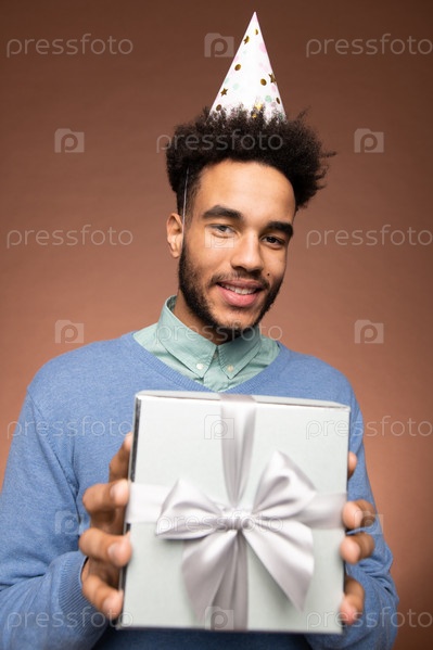 Молодой улыбающийся мужчина держит подарочную коробку со своим подарком, показывая его вам
