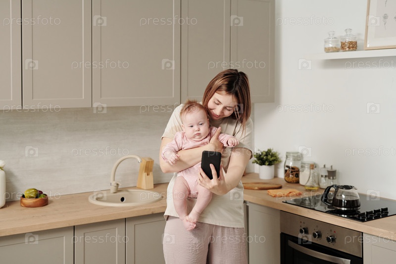 Молодая мать со смартфоном, которая держит свою дочь