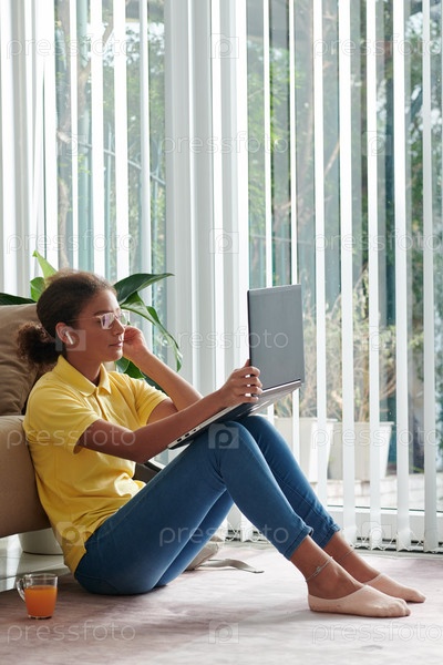 Девушка в беспроводных наушниках с использованием ноутбука