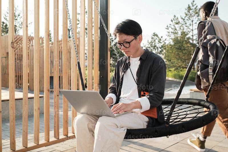 Женщина, работающая на ноутбуке в парке