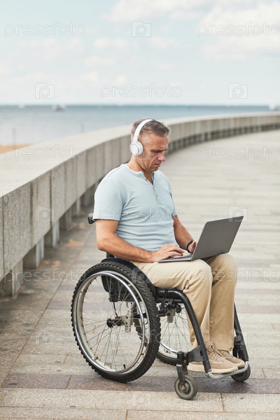 Человек в инвалидном кресле, использующий ноутбук на улице