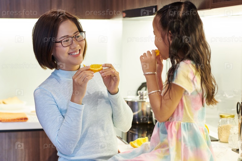Мама и дочь едят апельсины