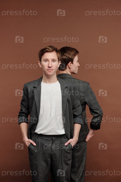 Уверенный в себе мужчина в сером костюме стоит спиной к спине с братом
