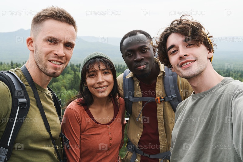 Автопортрет позитивных молодых межрасовых туристов, стоящих вместе в горах во время приключений