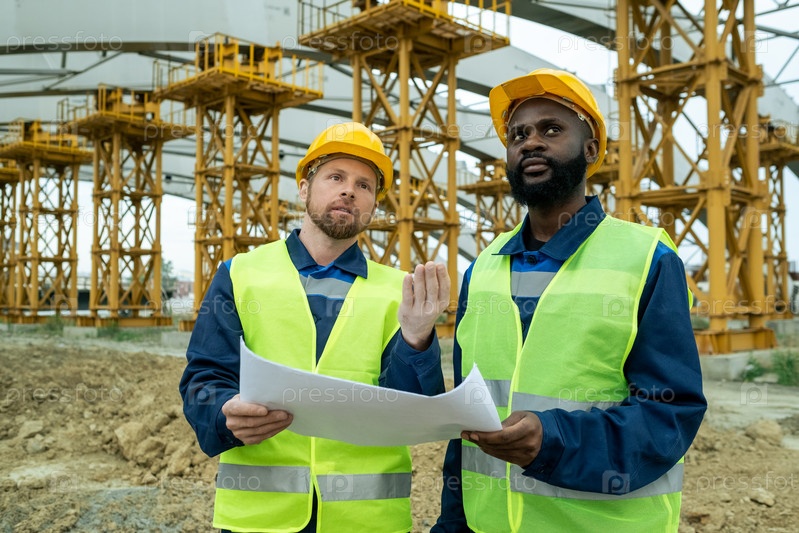 Бородатый инженер-мужчина показывает новое строительство африканскому коллеге